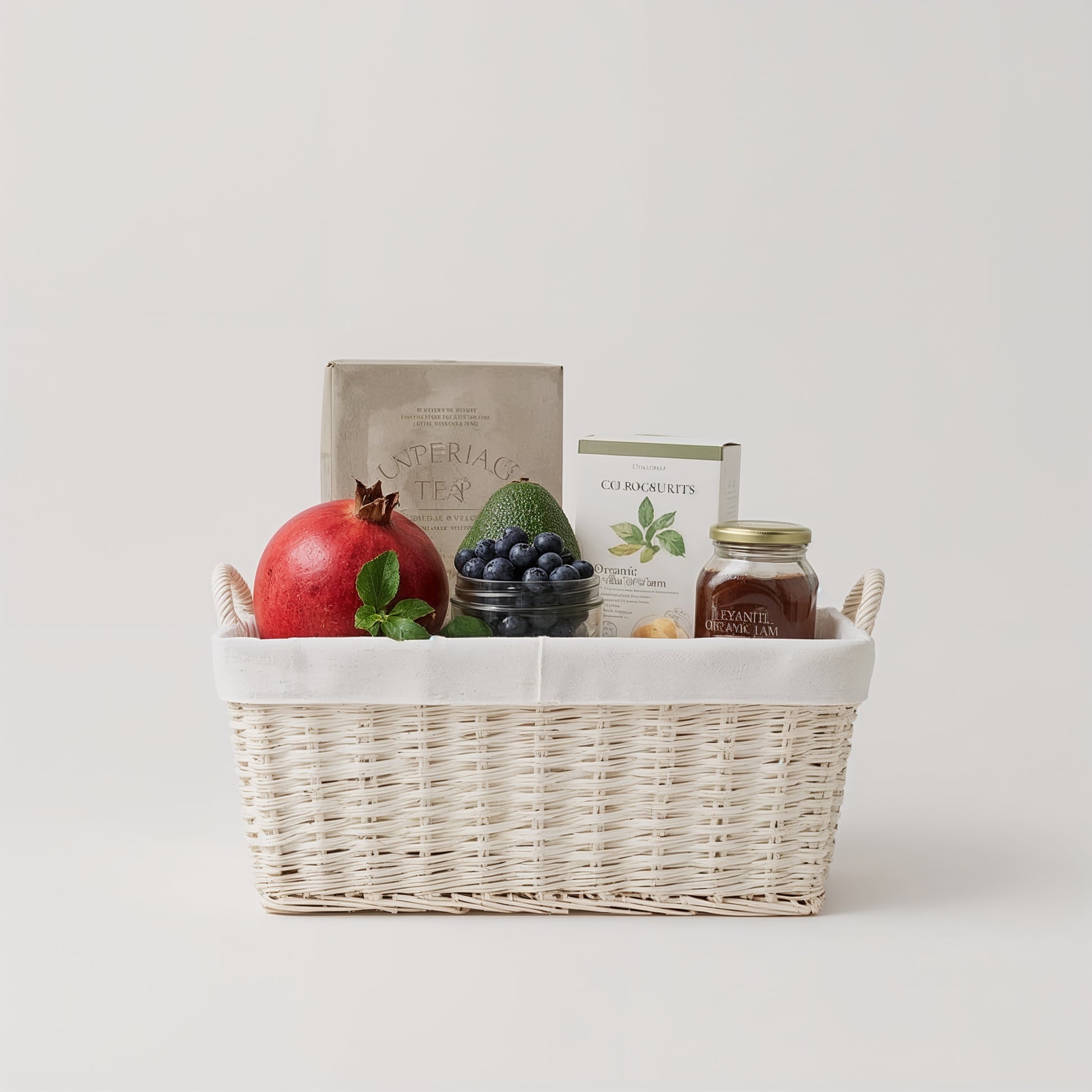The Seraphic Restorative is a curated wellness basket designed for those prioritizing recovery and regeneration. This 6.5 kg collection combines antioxidant-rich fruits—pomegranates, blueberries, and avocados—with premium organic herbal teas and artisanal, locally-sourced jam. Each element is selected for nutritional density and purity, supporting cellular repair and sustained wellness. Ideal for post-recovery periods, immune support, or gifting to someone embarking on a health-focused journey.
